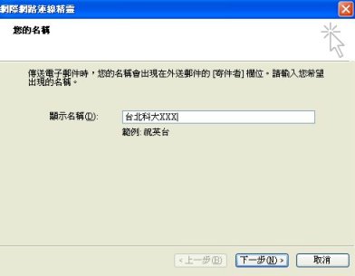 1.開啟Outlook Express -> 工具 -> 帳號 -> 新增 -> 郵件 -> 輸入顯示名稱(隨意一識別名稱) -> 下一步